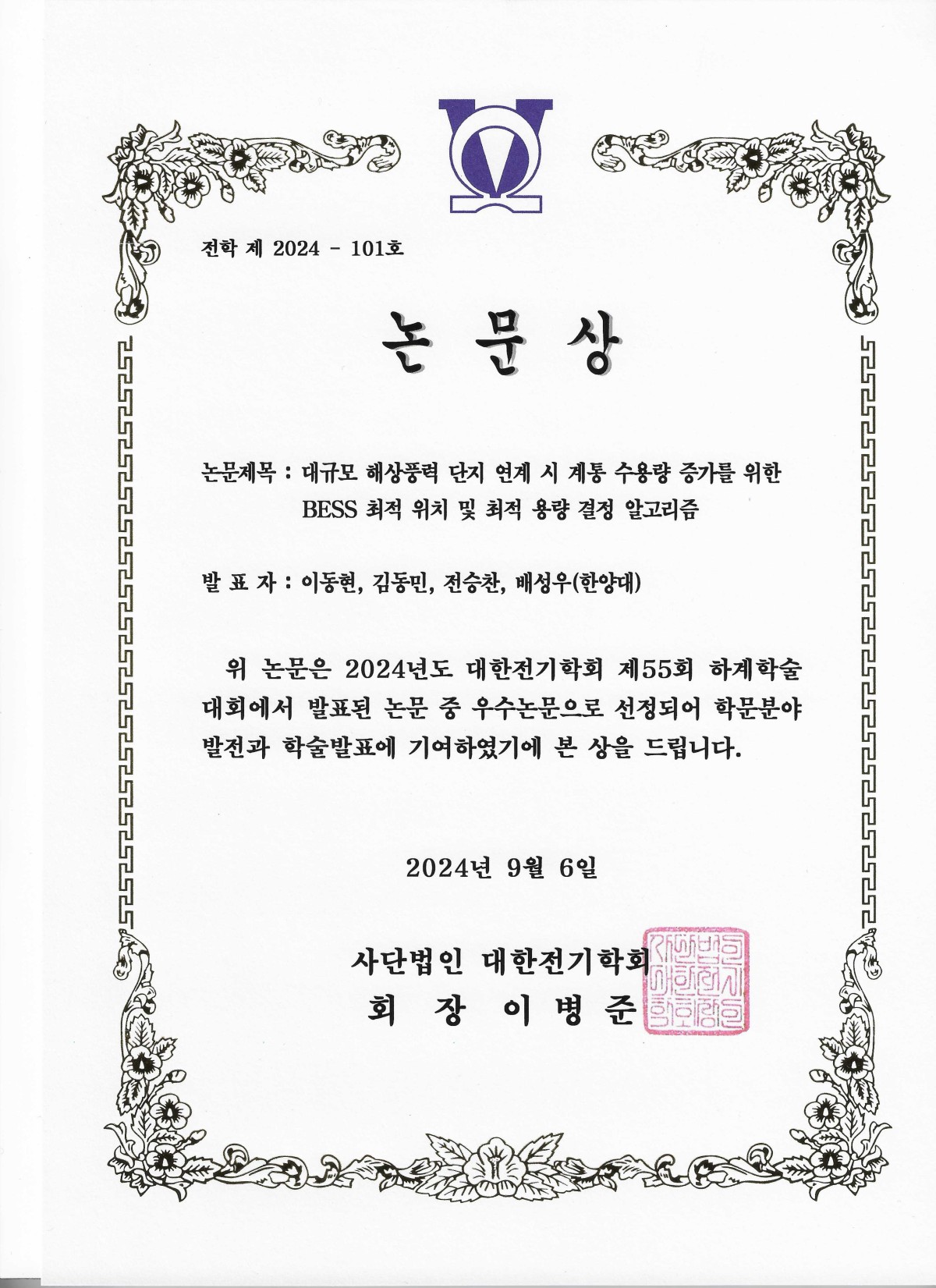 2024 대한전기학회 하계학술대회 논문상 수상, 이동현 석사과정
