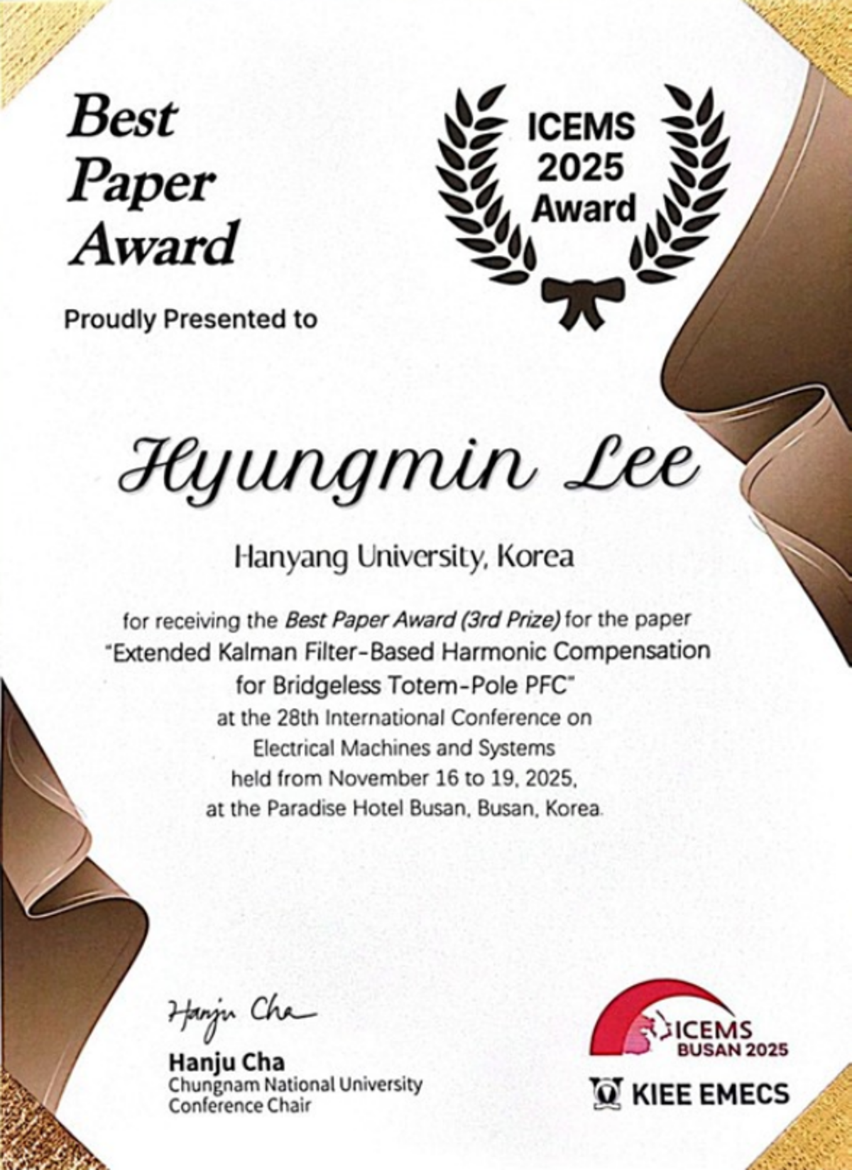 한양대 전기공학과 배성우 교수 연구실의 이형민 석사과정은 11월 16일부터 19일까지 부산 파라다이스 호텔에서 개최된 ‘ICEMS 2025’에서 Best Paper Award을 수상했다. 이형민 석사과정의 수상 논문명은 ‘Extended Kalman Filter-Based Harmonic Compensation for Bridgeless Totem-Pole PFC’이다.